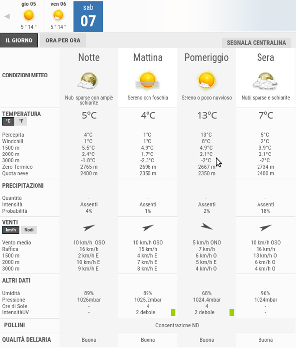 Sabato 7 Gennaio avremo cieli in prevalenza sereni o poco nuvolosi, con nubi in aumento fino a cieli nuvolosi in serata, non sono previste piogge.