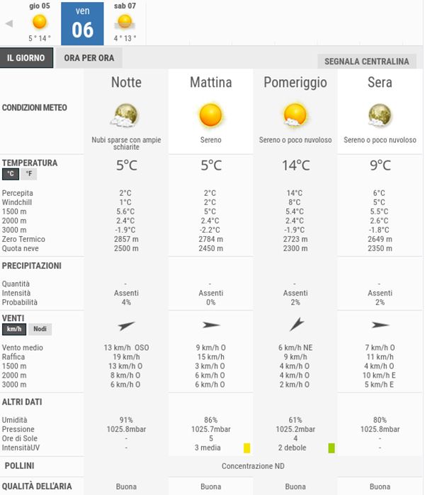 La temperatura massima registrata pare che sarà di 14°C, la minima di 5°C.