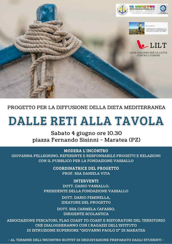 Il 4 Giugno alle ore 10:30 in Piazza Fernando Sisinni di Maratea si terrà l’evento conclusivo “Dalle Reti alla Tavola“, il Progetto per diffondere la Cultura e i fondamenti della Dieta Mediterranea.