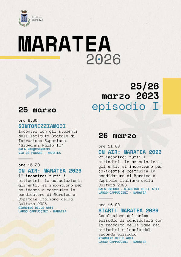 Tutti i cittadini di ogni età, le associazioni, le categorie professionali e i portatori di interesse sono chiamati a raccolta per prendere parte al primo incontro che sarà anche il primo passo verso la co-ideazione di Maratea2026 la Città degli orizzonti nuovi.