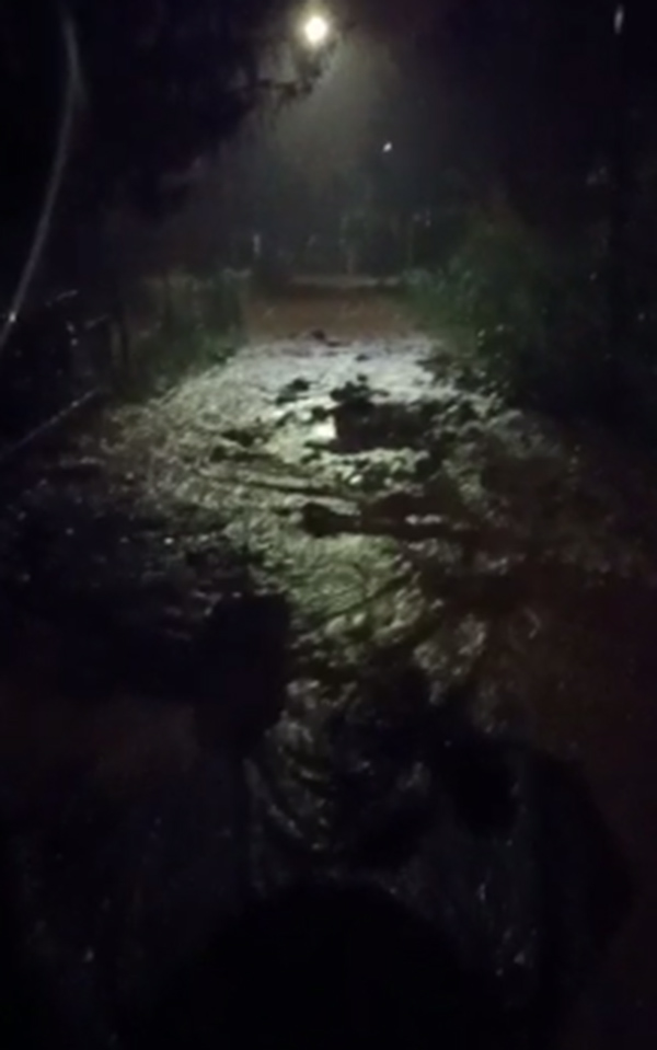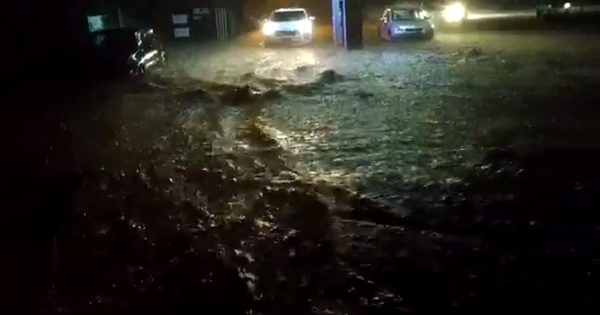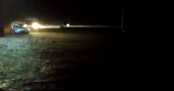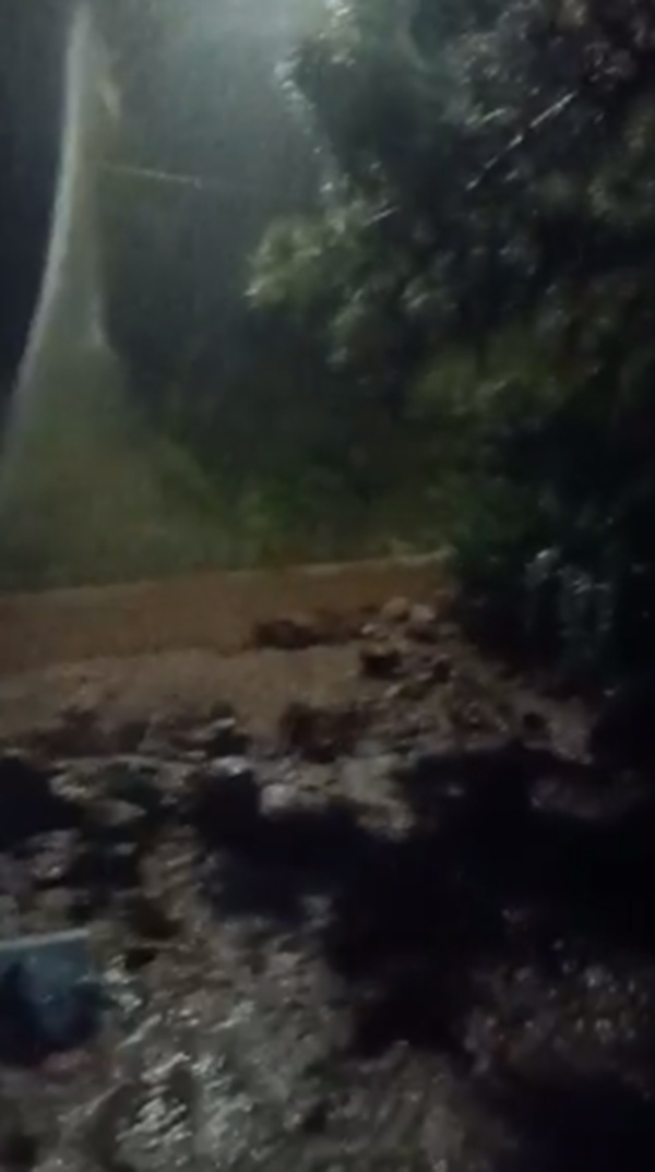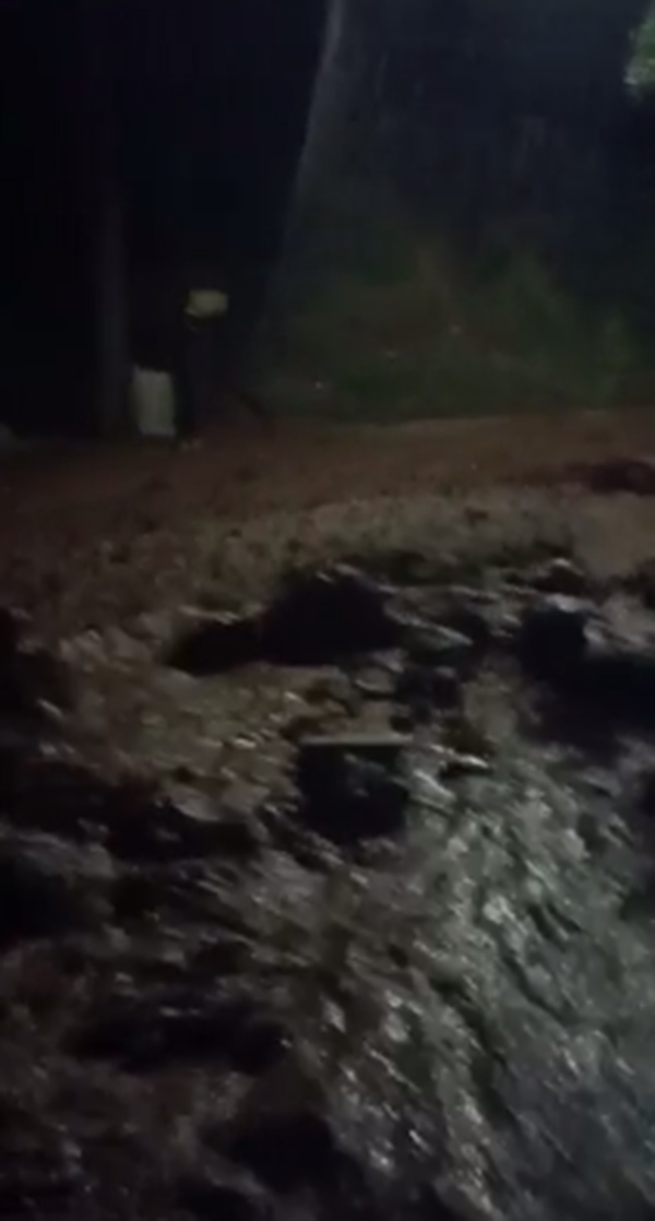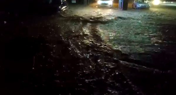 La pioggia incessante scorre come un vero e proprio fiume in piena sulla strada.