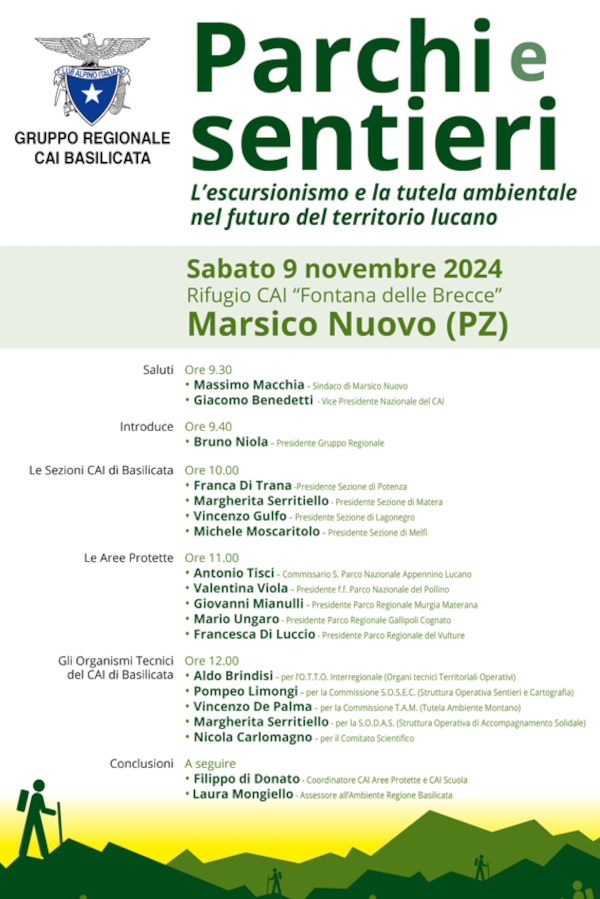 Il Gruppo Regionale del Club Alpino Italiano (CAI) della Basilicata è lieto di annunciare il convegno dal titolo “Parchi e sentieri: l’escursionismo e la tutela ambientale nel futuro del territorio lucano“, che si terrà il prossimo 9 novembre 2024, alle ore 9:30, presso il Rifugio Fontana della Brecce a Marsico Nuovo.