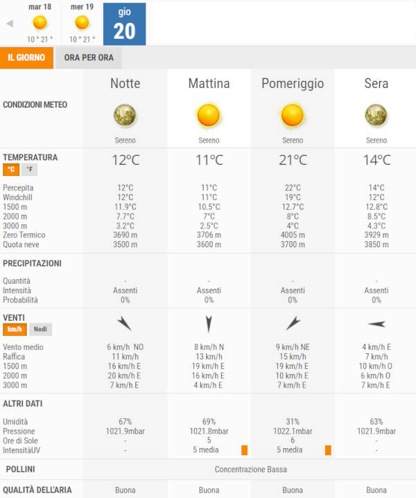 Giovedì 20 Ottobre, invece, bel tempo con sole splendente per l’intera giornata, non sono previste piogge.