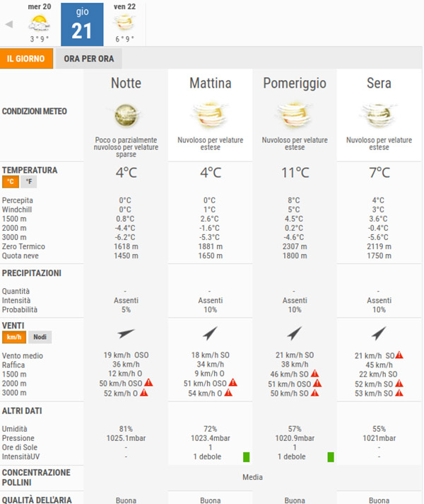 Secondo gli esperti di 3bmeteo, domani, Giovedì 21 Gennaio, avremo cieli in prevalenza parzialmente nuvolosi per l’intera giornata, non sono previste piogge.