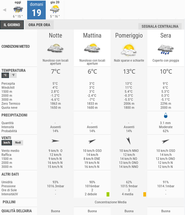 Secondo gli esperti di 3bmeteo, domani, Mercoledì 19 Aprile, avremo nubi sparse alternate a schiarite con tendenza a graduale aumento della nuvolosità fino a cieli coperti con piogge e rovesci anche temporaleschi in serata.