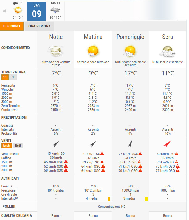 Secondo gli esperti di 3bmeteo, domani, Venerdì 9 Dicembre, avremo cieli in prevalenza poco nuvolosi per l’intera giornata, salvo la presenza di qualche addensamento serale, non sono previste piogge.