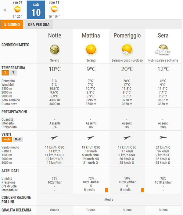 La temperatura massima registrata dovrebbe essere di 19°C, la minima di 10°C.