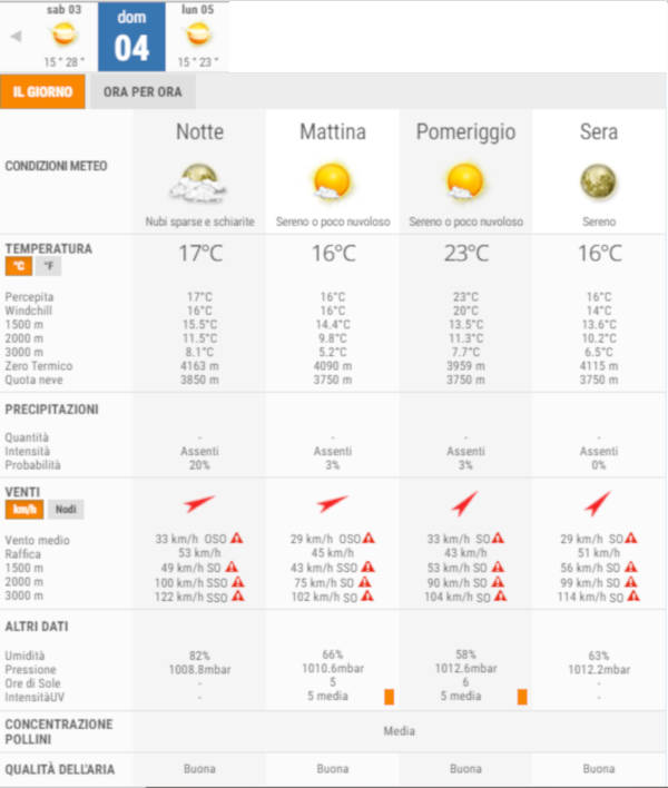 La temperatura massima registrata dovrebbe essere di 23°C, la minima di 15°C.