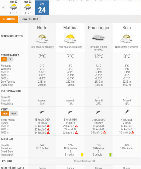 Giovedì 24 Novembre avremo cieli in prevalenza poco nuvolosi, con nubi in aumento dal pomeriggio fino a cieli nuvolosi o molto nuvolosi con deboli piogge in serata, non sono previste piogge.