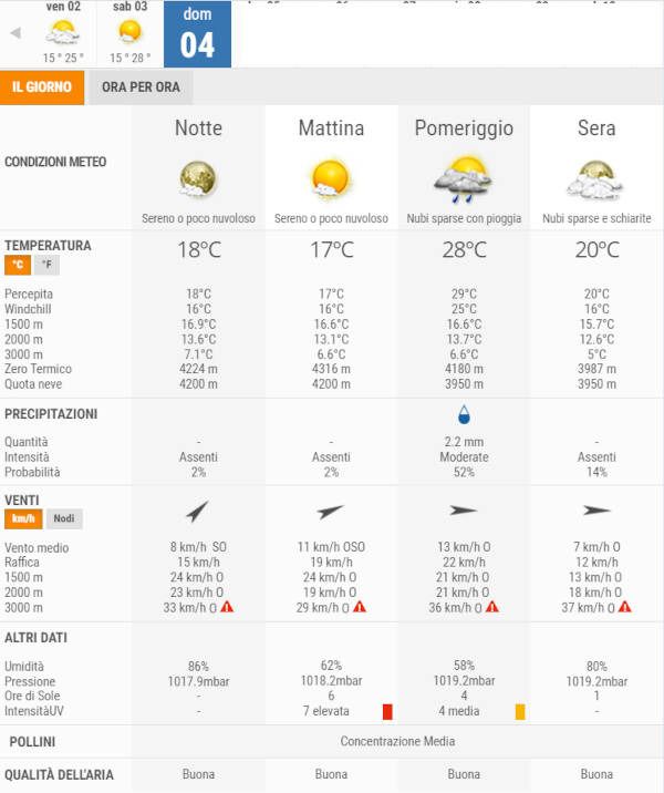 Domenica 4 Settembre, invece, avremo cieli in prevalenza poco nuvolosi, salvo addensamenti talora compatti nelle ore centrali della giornata con associate deboli piogge.