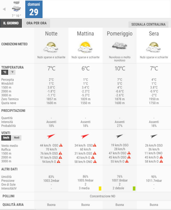 Secondo gli esperti di 3bmeteo, domani, Mercoledì 29 Novembre, avremo nubi sparse alternate a schiarite per l’intera giornata, non sono previste piogge.