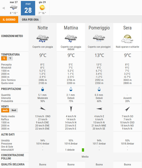 Secondo gli esperti di 3bmeteo, domani, Mercoledì 28 Ottobre, avremo cieli molto nuvolosi o coperti con deboli piogge, in assorbimento dalla sera.