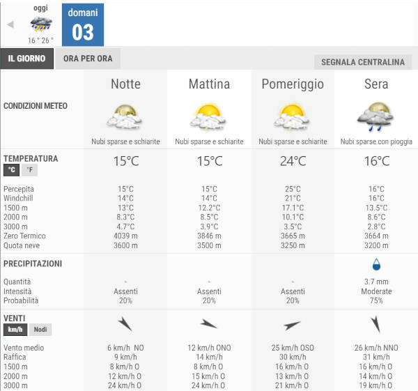 Secondo gli esperti di 3bmeteo, domani, Mercoledì 3 Luglio, avremo nubi sparse alternate a schiarite con tendenza a graduale aumento della nuvolosità fino a cieli coperti con deboli piogge in serata.