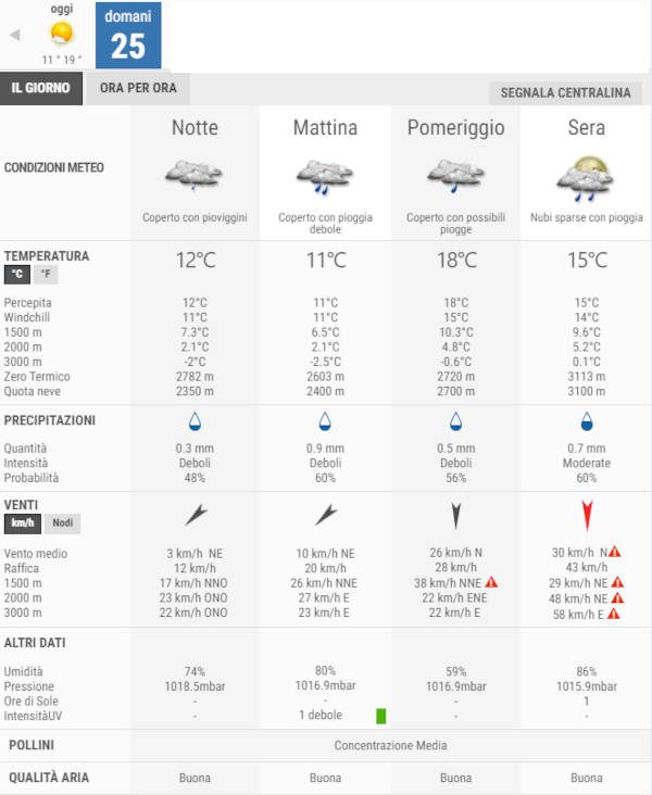 Secondo gli esperti di 3bmeteo, domani, Lunedì 25 Settembre, avremo cieli molto nuvolosi o coperti con deboli piogge per l’intera giornata.