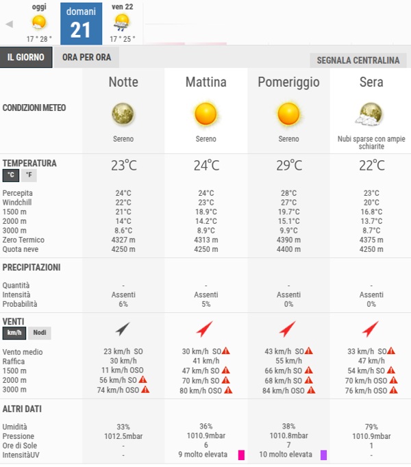 Secondo gli esperti di 3bmeteo domani, Giovedì 21 Agosto avremo bel tempo con sole splendente per l’intera giornata, non sono previste piogge.