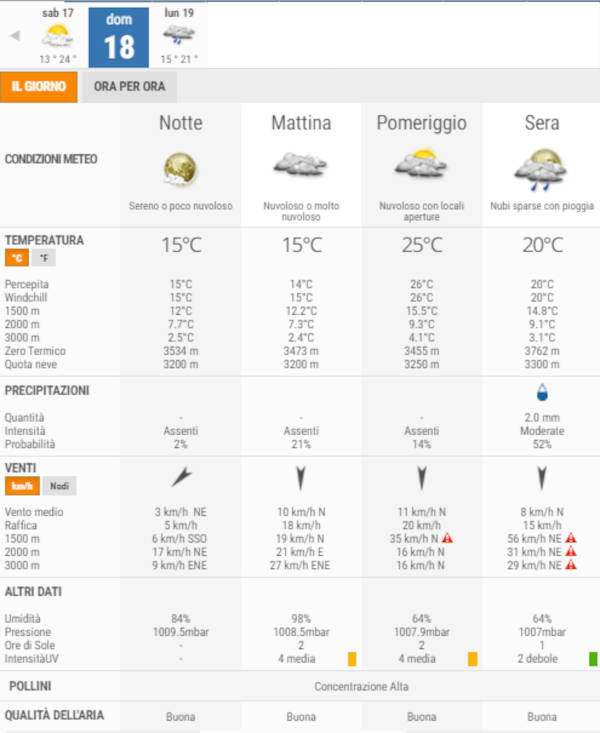 La temperatura massima registrata dovrebbe essere di 21°C, la minima di 15°C.