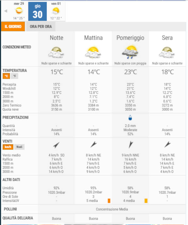 Secondo gli esperti di 3bmeteo, domani, Giovedì 30 Settembre, avremo nubi sparse e schiarite il mattino e la sera, nubi sparse con pioggia il pomeriggio.