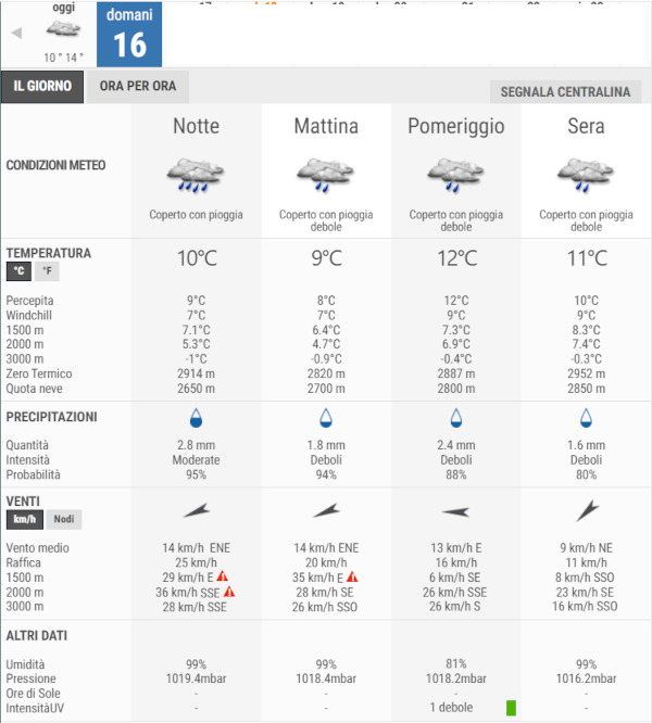 Invece, Giovedì 16 Ottobre avremo cieli molto nuvolosi o coperti con deboli piogge per l’intera giornata.