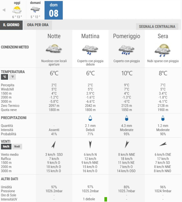 Domenica 8 Marzo avremo cieli molto nuvolosi o coperti con deboli piogge per l’intera giornata.