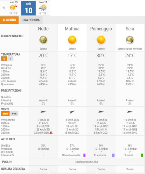 La temperatura massima registrata dovrebbe essere di 30°C, la minima di 17°C.