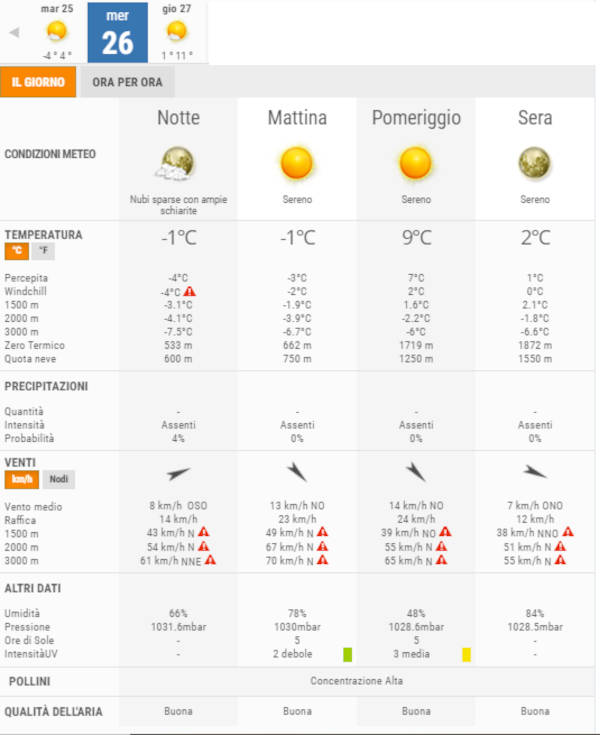 La temperatura massima registrata pare che sarà di 9°C, la minima di -1°C.