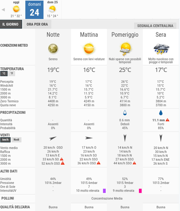 Secondo gli esperti di 3bmeteo, domani, Sabato 24 Giugno, avremo cieli in prevalenza poco nuvolosi, con nubi in progressivo aumento dal tardo pomeriggio fino a cieli molto nuvolosi con piogge e rovesci anche temporaleschi in serata.