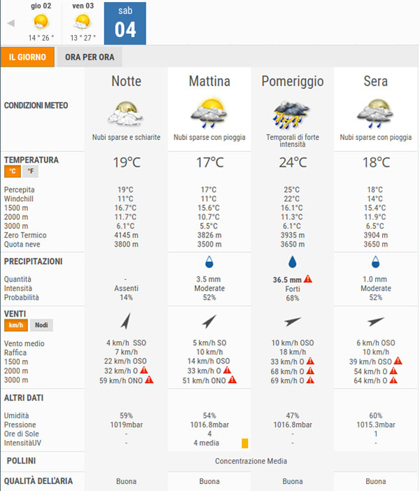 Sabato 4 Settembre, invece, avremo cieli molto nuvolosi al mattino con deboli piogge e probabili temporali.