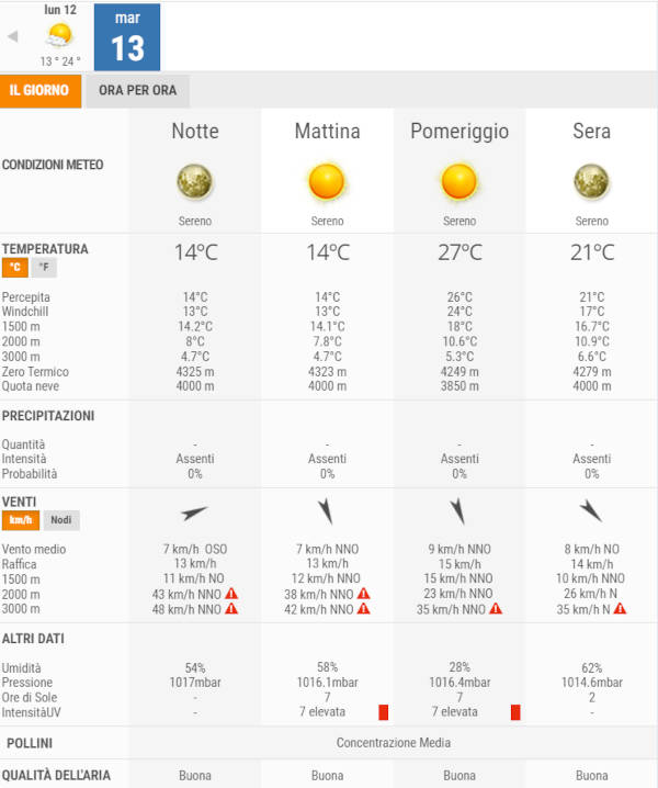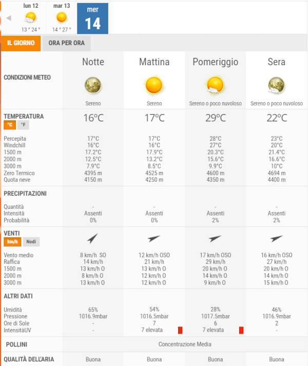 Mercoledì 14 Settembre, invece, avremo bel tempo con sole splendente per l’intera giornata, non sono previste piogge.