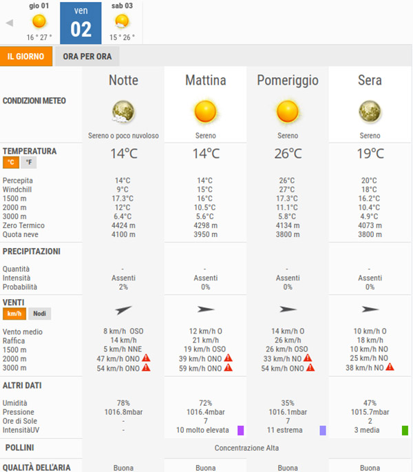 Secondo gli esperti di 3bmeteo, domani, Venerdì 2 Luglio, avremo bel tempo con sole splendente per l’intera giornata, non sono previste piogge.