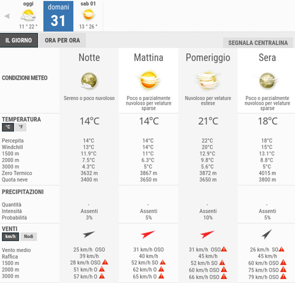 Secondo gli esperti di 3bmeteo, domani, Venerdì 31 Maggio, avremo cieli in prevalenza parzialmente nuvolosi per l’intera giornata, non sono previste piogge.