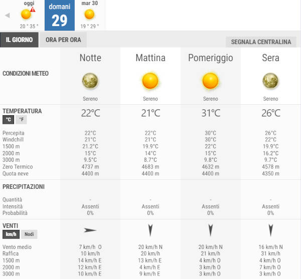Secondo gli esperti di 3bmeteo, domani, Lunedì 29 Luglio, avremo bel tempo con sole splendente per l’intera giornata, non sono previste piogge.