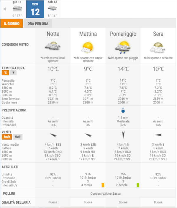 Secondo gli esperti di 3bmeteo, domani, Venerdì 12 Novembre, avremo nubi sparse e schiarite il mattino e la sera, nubi sparse con pioggia il pomeriggio.