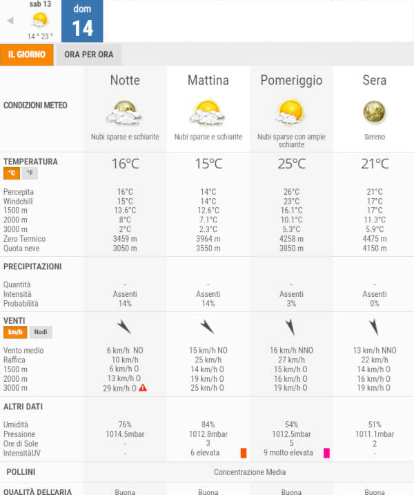 Secondo gli esperti di 3bmeteo, domani, Domenica 14 Agosto, avremo giornata in prevalenza soleggiata, salvo presenza di nubi sparse al mattino, non sono previste piogge.