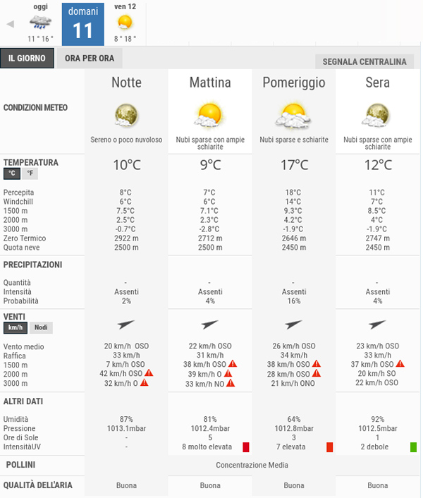 Secondo gli esperti di 3bmeteo, domani, Giovedì 11 Maggio, avremo cieli in prevalenza poco nuvolosi, salvo variabilità nelle ore centrali della giornata, non sono previste piogge.