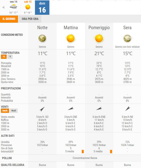 Domenica 16 Ottobre, invece, bel tempo con sole splendente per l’intera giornata, non sono previste piogge.