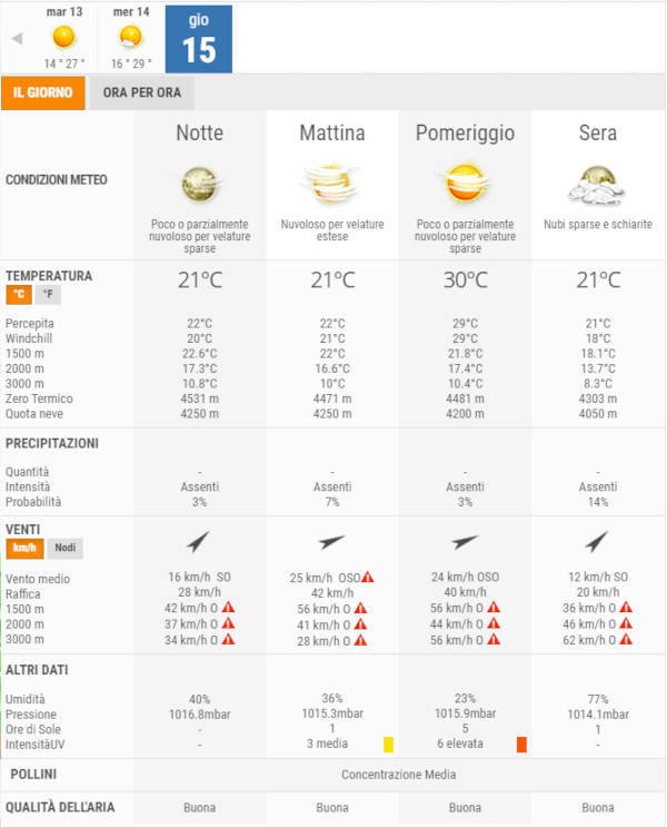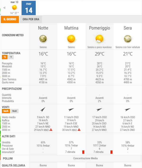 Giovedì 15 Settembre, invece, avremo cieli in prevalenza poco o parzialmente nuvolosi per l’intera giornata, non sono previste piogge.