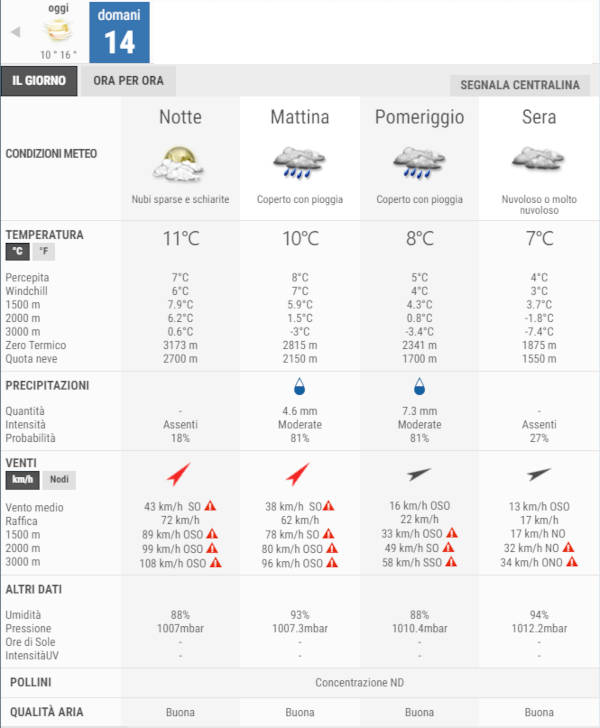 Secondo gli esperti di 3bmeteo, domani, Giovedì 14 Dicembre, avremo cieli molto nuvolosi o coperti con piogge e rovesci anche temporaleschi.