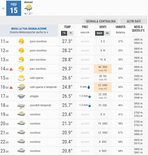 Secondo gli esperti di 3bmeteo oggi, Venerdì 15 Agosto avremo sereni o poco nuvolosi al mattino, con nubi in aumento fino a cieli molto nuvolosi con piogge e rovesci anche temporaleschi dal pomeriggio, in attenuazione in serata.