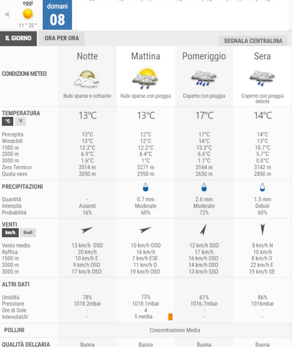 Secondo gli esperti di 3bmeteo, domani, Lunedì 8 Maggio, avremo cieli molto nuvolosi o coperti con deboli piogge, in temporanea intensificazione pomeridiana.