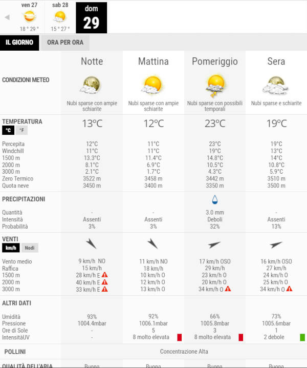 Domenica 29 Maggio, invece, avremo cieli in prevalenza poco nuvolosi, con nubi in contenuto aumento dal tardo pomeriggio; prevista pioggia.