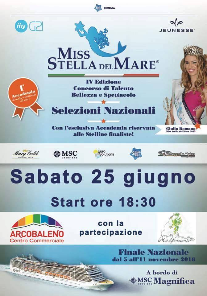 Oggi pomeriggio a partire dalle ore 18:30 si svolgeranno le selezioni Nazionali per Miss Stella del Mare 2016 presso il Centro Commerciale Arcobaleno di Melfi (Potenza).