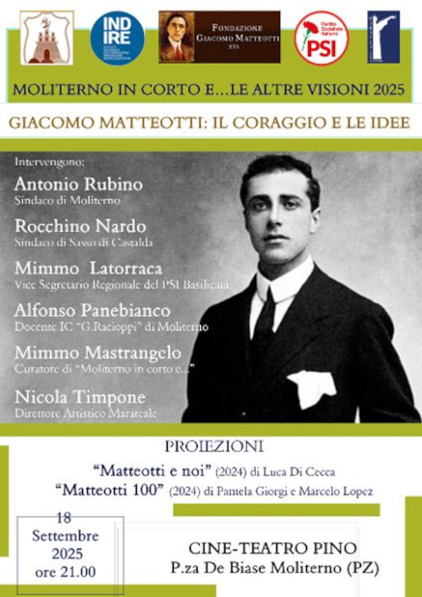 La figura di Giacomo Matteotti verrà ricordata il 18 settembre nel centro della Val D’Agri (Cine-teatro Pino , ore 21.00) nel corso di un appuntamento fuori programma della rassegna cinematografica “Moliterno in corto e…. Le altre visioni 2025”, promossa dall’Amministrazione Comunale in collaborazione con il Festival Internazionale Marateale.
