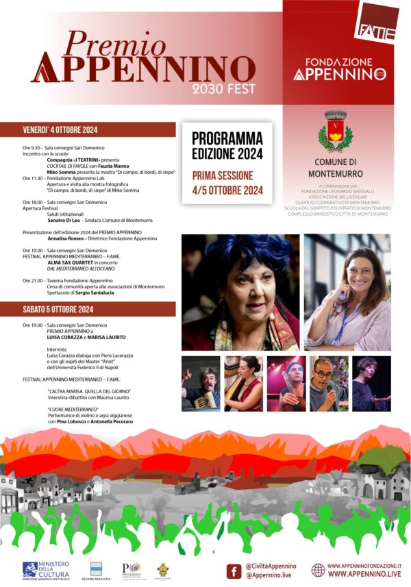 Prende il via a Montemurro la terza edizione del PREMIO APPENNINO 2030FEST, ideato e realizzato da Fondazione Appennino Ets, in collaborazione con l’Amministrazione Comunale, che come di consuetudine, dal primo week end di Ottobre apre un ciclo di eventi culturali, artistici e di spettacolo con l’obiettivo di dare valore ad esperienze e competenze, energie e passioni che possono essere messe insieme per una riscossa civica in grado di unire il Paese e rilanciarlo, non solo da Nord a Sud ma anche connetterne in maniera funzionale i centri e le periferie, le aree forti e i territori deboli, le zone costiere con le aree interne.