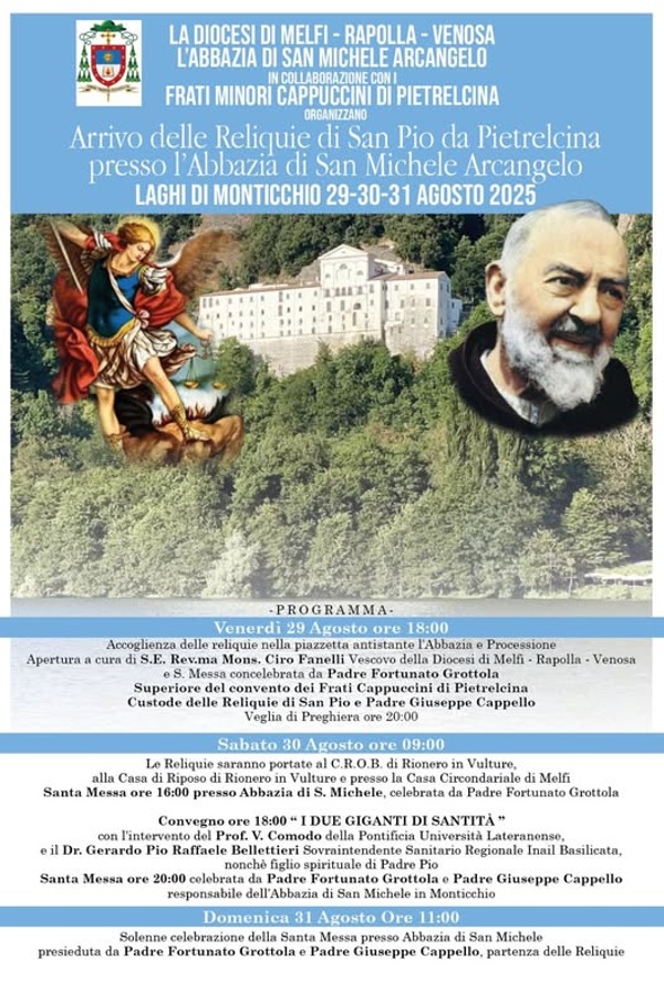Questo il programma dell’arrivo delle reliquie di San Pio da Pietrelcina presso l’abbazia di San Michele Arcangelo ai Laghi di Monticchio.