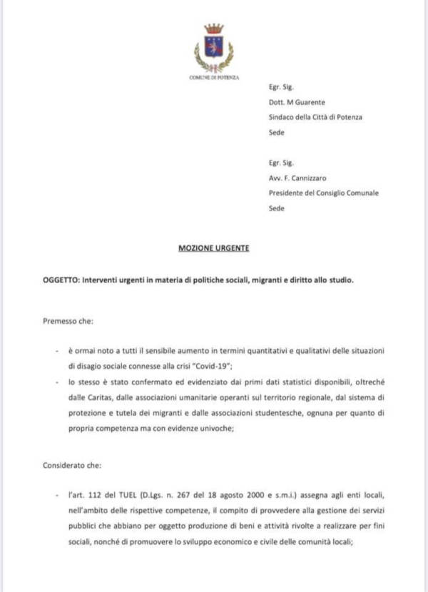 Questi volontari ed operatori chiedevano semplicemente al Sindaco, alla giunta Comunale ed alla maggioranza tutta testualmente di ‘Indicare una strada concreta a tutti gli enti locali, anche di concerto con l’Amministrazione Regionale, per svolgere un ruolo di guida e capofila in questo periodo di difficoltà per l’intera comunità potentina e lucana’.