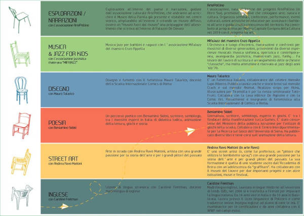 “Un percorso che durerà tutto il mese di luglio, durante il quale saranno proposte varie attività: esplorazioni all’interno del paese e narrazioni, guidate dall’associazione culturale ArtePollino, che andranno ad arricchire il Museo della Parola già presente e visitabile nel centro storico, ampliandolo all’esterno e creando un ‘MUSEO DIFFUSO DELLA PAROLA’, ovvero un ‘museo fuori dal museo’ una propaggine dell’allestimento che attualmente si trova all’interno di Palazzo De Donato; musica jazz per bambini e ragazzi con l’associazione MifaJazz del maestro Enzo Appella; disegno e fumetto con il fumettista Mauro Talarico, docente della Scuola Internazionale Comics di Roma; un percorso poetico con Beniamino Sidoti, scrittore, semiologo, tra i massimi esperti in Italia di didattica ludica, animazione della lettura, giochi e storia; arte in strada con Andrea Ravo Mattoni, street artist con una grande passione per la storia dell’arte e per i grandi pittori del passato; lezioni di lingua straniera con Caroline Feetman, docente madrelingua di inglese.