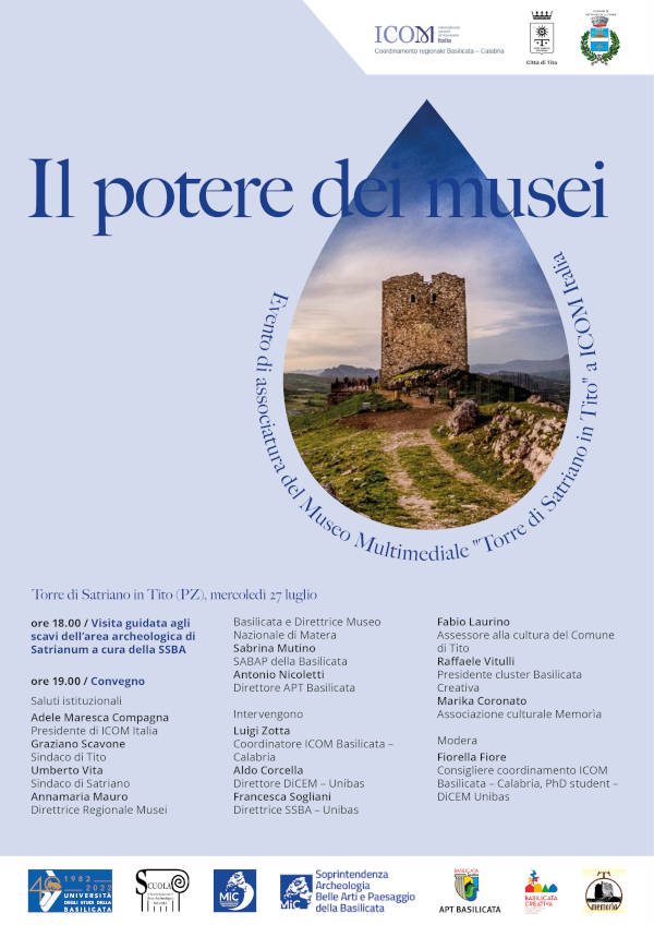 Si terrà presso il Museo Multimediale della torre normanna di Torre di Satriano in Tito il convegno “Il potere dei musei. Evento di associatura del Museo Multimediale “Torre di Satriano in Tito” a ICOM Italia”, organizzato: