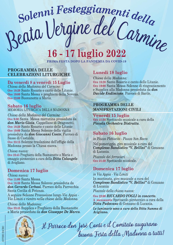 “A Baragiano Scalo tutto è pronto per la tradizionale festa in onore della Beata Vergine del Carmine in calendario da domani venerdì 15 luglio fino a domenica 17 luglio”.