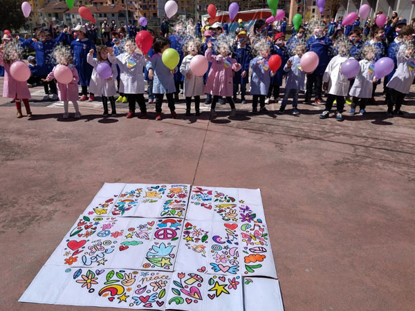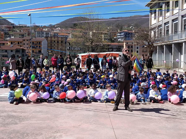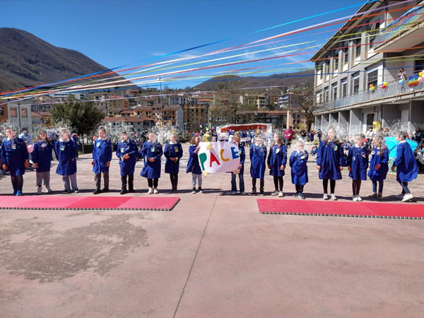 Lo spazio all’aperto della scuola primaria ha i colori dell’arcobaleno che si riflettono in un cielo azzurro Mercoledì 13 Aprile 2022 per accogliere gli alunni della scuola dell’infanzia e primaria e il loro “Recital musicale della Pace”.
