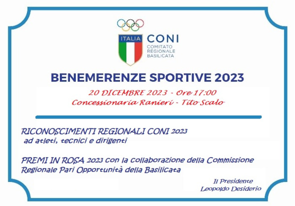 Si terrà domani, Mercoledì 20 Dicembre a partire dalle ore 17:00 a Tito scalo, la Cerimonia di Consegna delle Benemerenze Sportive, appuntamento annuale del CONI che premia dirigenti, tecnici, atleti e società, che a vario titolo si sono distinti per meriti sportivi, organizzativi e dirigenziali.